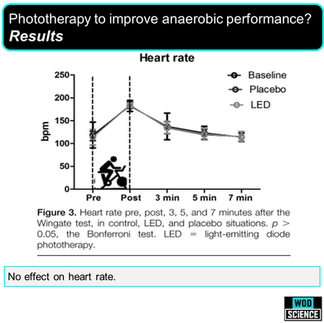 📝 16 active, healthy men performed three 30s all-out sprints on the bike. One time to assess baseline numbers, one time with a placebo and on time after phototherapy applied at 16 different spots at the leg.